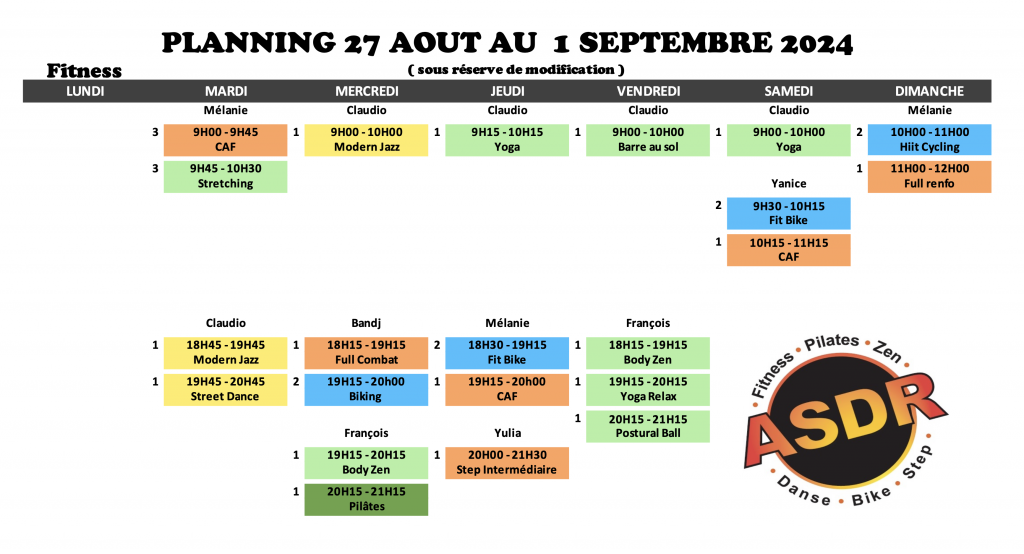 Planning Fitness ASDR l’ASDR reprend ses cours le mardi 27 août 2024 à 9h. Nous espérons vous voir nombreux 😉